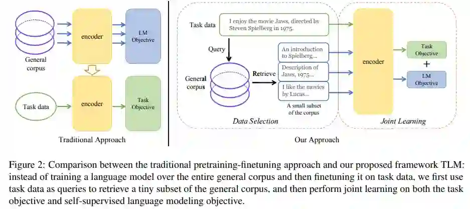 为了从大规模通用语料中抽取关键数据,TLM 首先以任务数据作为查询,对通用语料库进行相似数据的召回。这里作者选用基于稀疏特征的 BM25 算法 [2] 作为召回算法。之后,TLM 基于任务数据和召回数据,同时优化任务目标和语言建模目标 (如下图公式所示),从零开始进行联合训练。