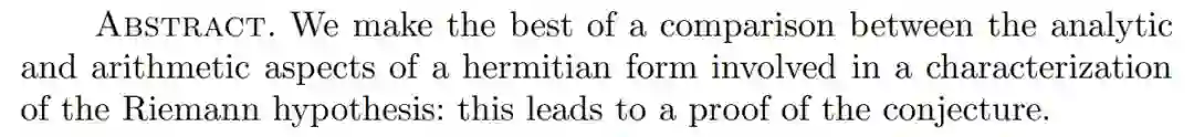 近日兰斯大学的 Andre Unterberger 在 arXiv 上传论文《A pseudodifferential proof of the Riemann hypothesis》,对黎曼猜想涉及到的厄米特形式(hermitian form)的分析和算术部分进行了详尽的比较,从而证明了该猜想。