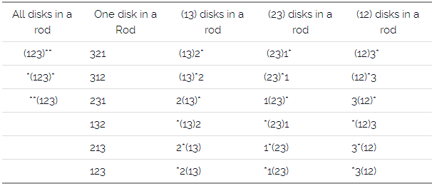 其中,(12)3* 表示,圆盘1和圆盘2在最左边的木棍上面(从上往下编号),圆盘3在中间那个木棍上面,最右边的木棍没有圆盘。