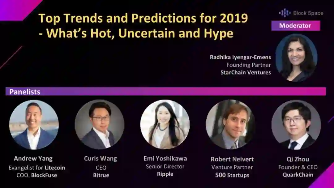 现场座谈由Radhika Iyengar-Emens 主持, 参与座谈的嘉宾包含了Qi Zhou, Robert Neivert, Curis Wang, Emi Yoshikawa 以及Andrew Yang。各位嘉宾就 2019 预测展开了讨论。其中有代表性的要属 Robert Neivert,他分享到:“ 我们预期整个行业将由空谈转向实质性产品。近期大家看到的价格下跌其实是有利于市场健康的,因为这将促使项目方必须能作出了不起的真正有价值的产品,而不是仅仅想从中捞一笔快钱。”