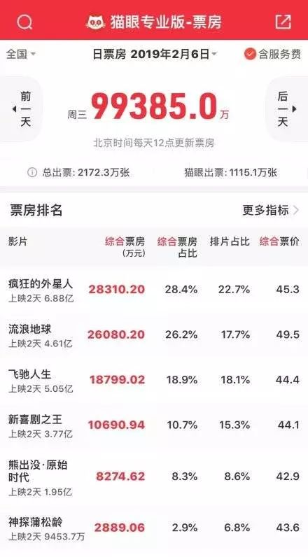 其中,《疯狂的外星人》票房超过2.83亿,《流浪地球》票房超过2.60亿,《飞驰人生》票房超过1.87亿。大年初一和初二(2月5~6日),《疯狂的外星人》(上映两天)票房6.88亿,上座率43.7%;《流浪地球》(上映两天)票房4.61亿,上座率49.7%,飞驰人生(上映两天)票房5.05亿,上座率44.7%。