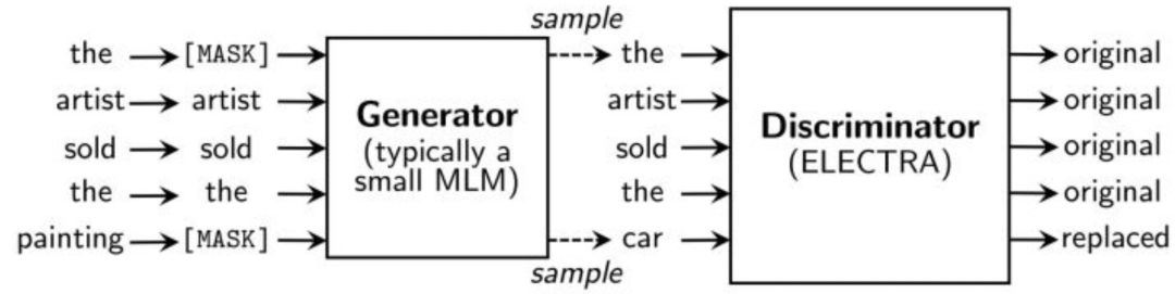 提出了新的预训练任务和框架,把生成式的Masked language model(MLM)预训练任务改成了判别式的Replaced token detection(RTD)任务,判断当前token是否被语言模型替换过。使用一个MLM的G-BERT来对输入句子进行更改,然后给D-BERT去判断哪个字被改过,如下: