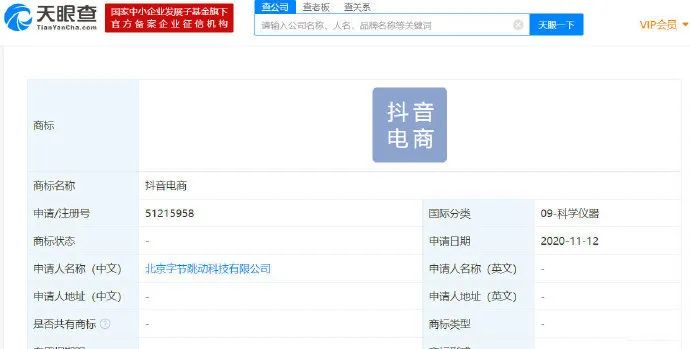 天眼查 App 显示,近日,北京字节跳动科技有限公司新增一条名为“抖音电商”的商标信息。商标申请时间为 2020 年 11 月 12 日,国际分类为广告销售,商标状态为“商标申请中”。此前抖音短视频已经更名为抖音,去掉短视频三个字,暗示着抖音已经不仅仅满足于短视频业务,据了解,实际上,抖音已经拓展到直播、电商、社交、金融、游戏等业务。此次抖音放弃了多年来使用的短视频命名模式,或成为抖音进一步扩张的开始。