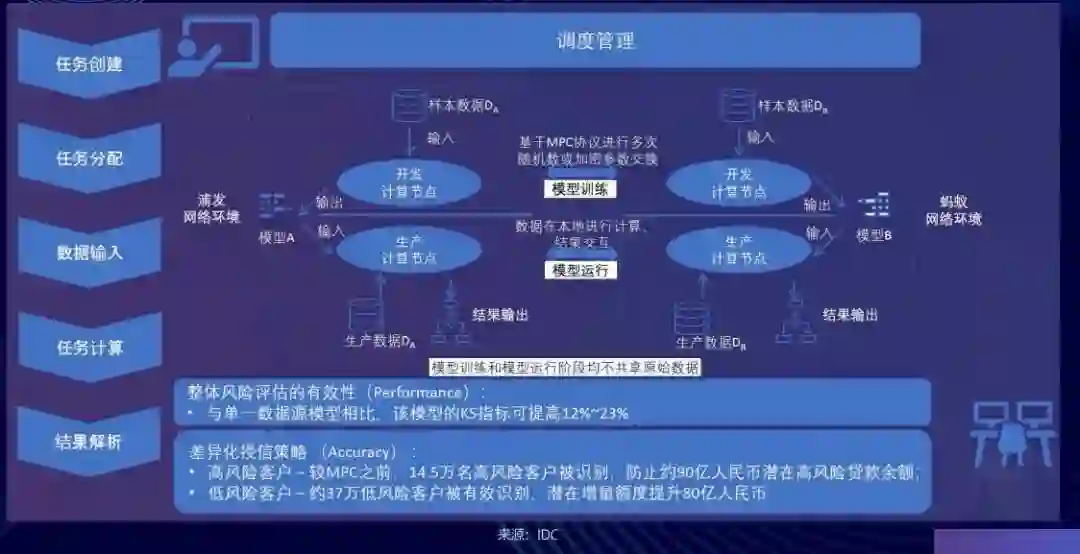基于这样的隐私保护技术,我们跟浦发银行做了联合风控的应用。我们在已经授权的数据上进行了尝试,使得模型训练和模型运行阶段均不共享原始数据。与单方面运算相比,联合运算的模式能够更好地提升模型的性能指标(比如将 KS 指标提升 12%~23%)。将模型产出的结果运用到风控场景中,我们能比较好地实现差异化的授信策略,防止潜在高风险贷款,从而将合适的贷款给到合适的人,真正实现防范金融风险的目的。