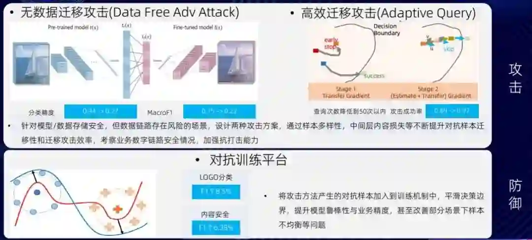 在对抗机器学习中,我们主要采用的是左右手互搏的方式,即假定我们对模型本身没有太多的了解,基于这样一个假定去攻击我们的系统(黑盒攻击)。我们设计了两种攻击方式(如下图)。通过这样的一些攻击方案以及样本的多样性,我们希望不断提升样本的迁移性和迁移攻击效率,以此来考察业务当中数字链路的安全情况,增强抗打击能力。同时,我们将对抗攻击中产生的样本也放到了机器学习训练的平台里面。我们搭建了一个对抗训练的平台,将前面攻击方法所产生的样本融合到训练机制中,使得决策边界从红线变到蓝线,相应来说会更平滑,更平滑意味着通用性会变得更好,能够提升模型的鲁棒性,甚至在某些情况下能够改善样本不均衡的问题,从而带来业务精度的提升 [10] 。
