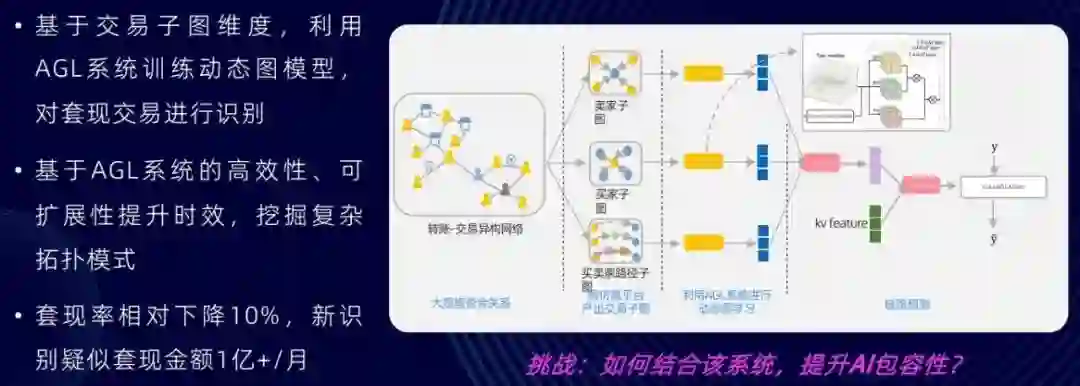 基于这样一个系统,我们首先设计了一个反套现的应用。我们利用这种转账交易的大规模资金的关系,针对买家子图、卖家子图、买卖家路径子图,通过图仿真产生出交易子图,然后再利用 AGL 系统进行动态的图学习,学习到图表征后我们会进行相应的链接预测,对大规模资金关系中存在的套现交易进行识别,使得套现率有比较大幅度的下降(相对下降 10%)。