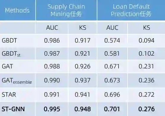 我们跟一些传统方法(如 GBDT、GAT)做了对比。结果显示,我们这个结合了时空信息的方法能够在中小企业的金融诉求预测上大幅改进模型的性能。主要原因在于,我们的方法结合了很多图上面的信息,而且设计了时空注意力的机制,能够比较好地融合多元、多维度的信息,体现出企业之间比较复杂的族群相关度,从而识别中小企业的信用评分,基于这样的信用评分助力他们享受对应的金融服务。