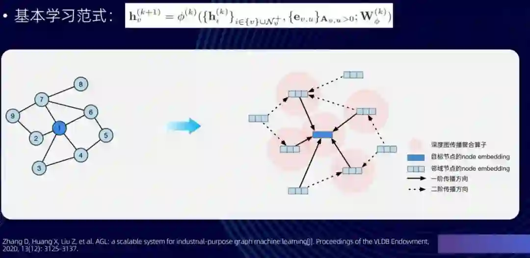 我们知道,在机器学习中,工程是算法的一个底座:没有强大工程的支持,算法很难被大规模应用。为了支持前面所说的工业级图数据的结构,我们首先研发了一个图学习系统——AGL(Ant Graph Learning)[1],这个系统会依据图神经网络里的两个经典操作——汇聚和更新——进行学习。我们这里列了一个基本公式。一个可以捕捉到 k-hop 邻居的图神经网络,它基本的 k 层的学习范式如图上所示,从示意图上也可以看到这里面所做的传播和聚合的方向: