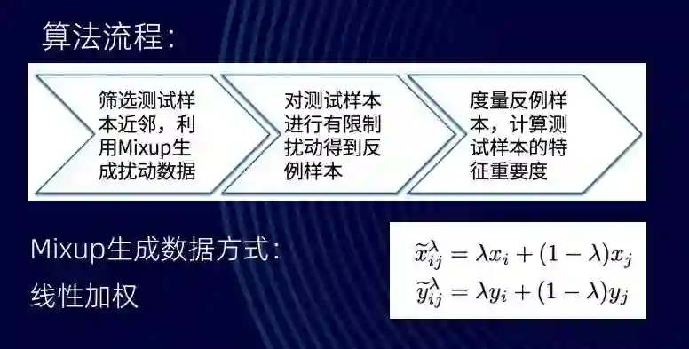 这个方法本身不是很复杂,算法的流程主要分三步:首先,它会去筛选测试样本的近邻,利用 Mixup 生成扰动数据;然后,它会对测试样本进行有限制的扰动得到反例样本;最后,它通过度量反例样本,计算测试样本的特征重要度,来给出任意模型的可解释性。
