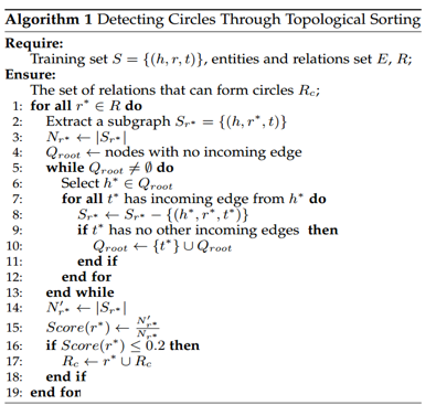 层次结构的发现(Hierarchical Structure Discovery):以往的文献表明,DAG(有向无环图)有着独特的层次结构,从而可以利用许多算法进行发掘。由于许多DAG的子图并非具有层次结构,所以问题的关键在于检测其子图是否进一步具有层次结构,进而将问题聚焦到层次关系的发现(discoveryof hierarchical relations)。层次关系由于层次结构的原因是不能形成环状的,所以文中采用拓扑排序算法(topological sorting algorithm)来检测环状结构: