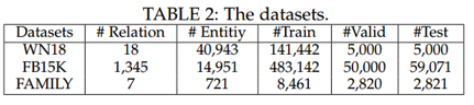 实验在FB15K,WN18K以及FAMILY三个数据集上进行。FAMILY是一个人工构建的包含五个家庭总共六代人的层次知识图谱。三个数据集所包含的数据分布如下: