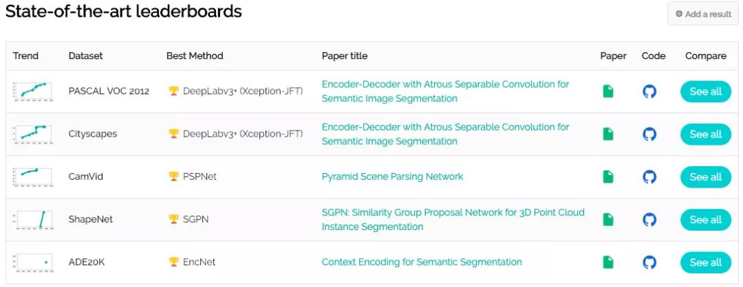 上面是按“Greatest”排序的前5篇论文,可以看到,ECCV 2018 的Encoder-Decoder with Atrous Separable Convolution for Semantic Image Segmentation这篇论文是 PASCAL VOC 2012上语义分割任务的SOTA,CVPR 2017的Pyramid Scene Parsing Network是Cityscapes上实时语义分割任务的SOTA,何恺明的Mask R-CNN是MHP v1.0上多人语义分割任务排名第2的模型。