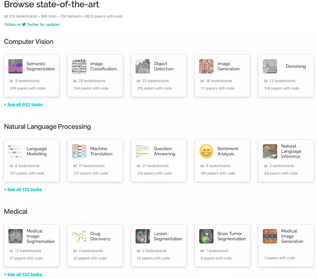 好消息是,Papers with Code团队刚刚发布了最新版本的Papers with Code网站。他们从庞大的数据库中提取了950+单独的ML任务,500+个评估表(包含SOTA结果),以及8500+篇公开了代码的论文。