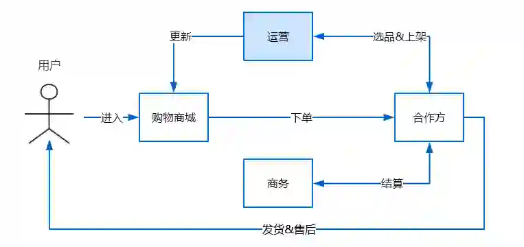 1. 业务包含了用户、商城、运营、商务、合作方(商家)等关键元素。