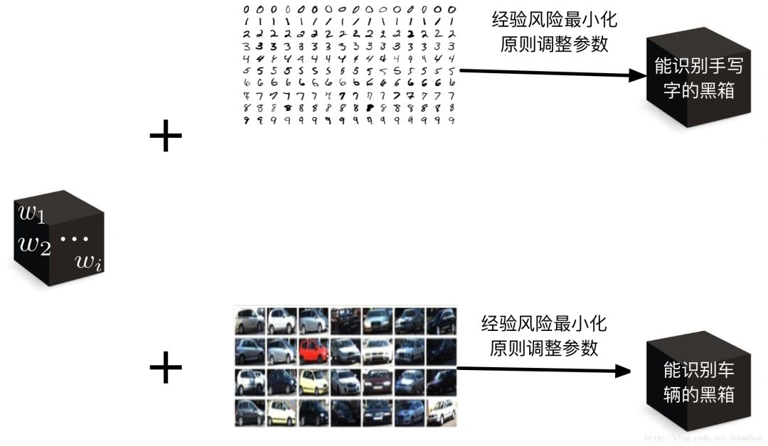 是经验风险最小化的函数,那么我们训练出来的这个“黑箱”就可以用于手写字识别了;另一方面,对于车辆识别来说,假设我们有车辆数据集,相同的思路,我们可以训练出一个黑箱来最做车辆识别。如下图所示:
