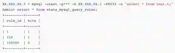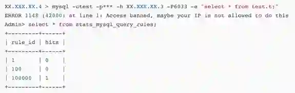 设置一条白名单(注意 rule_id 最小,并且 apply 设置为 0)insert into mysql_query_rules (rule_id,active,client_addr,match_digest,flagOUT,apply)values(1,1,'XX.XXX.XX.3','.',10,0);