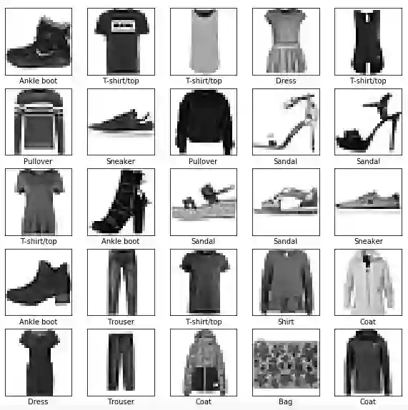 fashion MNIST数据集可以从Github获取。它包含10种类别的灰度图像,共7000个,每个图像的分辨率均为28x28px。下图以25张带有标签的图片向我们展示了该数据集中的数据。