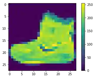 # Visualize the first image from the training datasetplt.figure()plt.imshow(train_images[0])plt.colorbar()plt.grid(False)