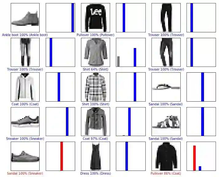 现在我们可以使用训练好的模型来对时尚类图像进行分类。 如果标签为红色,则表示预测与真实标签不符; 反之它就是蓝色的。