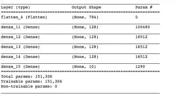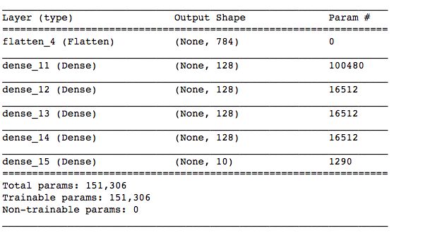 # Model a simple 6-layer neural networkmodel_6 = keras.Sequential([keras.layers.Flatten(input_shape=(28,28)),keras.layers.Dense(128, activation=tf.nn.relu),keras.layers.Dense(128, activation=tf.nn.relu),keras.layers.Dense(128, activation=tf.nn.relu),keras.layers.Dense(128, activation=tf.nn.relu),keras.layers.Dense(10, activation=tf.nn.softmax)])model_6.summary()