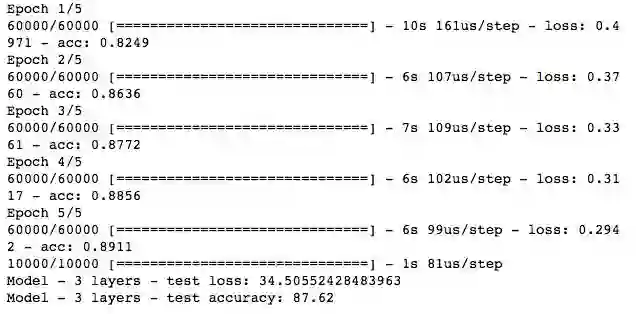 # Compile the model, specify: optimizer, loss function metricsmodel_3.compile(optimizer='adam',loss='sparse_categorical_crossentropy',metrics=['accuracy'])model_3.fit(train_images, train_labels, epochs=5)test_loss, test_acc = model_3.evaluate(test_images, test_labels)print("Model - 3 layers - test loss:", test_loss * 100)print("Model - 3 layers - test accuracy:", test_acc * 100)