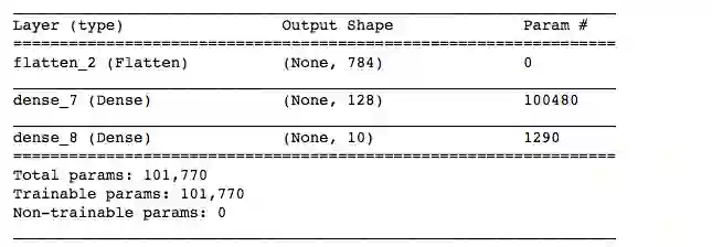 # Model a simple 3-layer neural networkmodel_3 = keras.Sequential([keras.layers.Flatten(input_shape=(28,28)),keras.layers.Dense(128, activation=tf.nn.relu),keras.layers.Dense(10, activation=tf.nn.softmax)])model_3.summary()