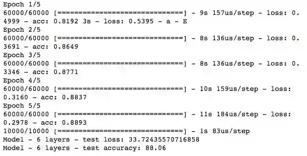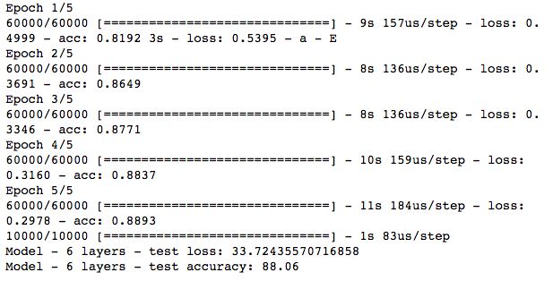 model_6.compile(optimizer='adam',loss='sparse_categorical_crossentropy',metrics=['accuracy'])model_6.fit(train_images, train_labels, epochs=5)test_loss, test_acc = model_6.evaluate(test_images, test_labels)print("Model - 6 layers - test loss:", test_loss * 100)print("Model - 6 layers - test accuracy:", test_acc * 100)