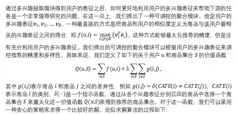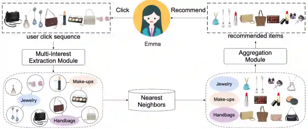 神经网络模型目前已经被广泛地应用于各种推荐系统中。这些基于神经网络的推荐算法通常只会从用户的行为序列中学习到一个用户表征向量,但是这个统一的表征向量往往无法反映用户在一段时期内的多种不同的兴趣。以下图为例,用户 Emma 的商品点击序列反映了她近期三种不同的兴趣,包括珠宝、手提包和化妆品。我们提出了一种可调控的多兴趣推荐框架来解决这种情形。多兴趣抽取模块会从用户的点击序列中捕获到用户多种不同的兴趣,然后可以用来召回一些相似的商品。聚合模块会将这些不同兴趣召回的商品整合起来作为推荐的候选商品,供下游的任务来使用。