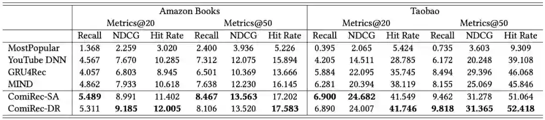 对于多兴趣抽取模块,我们在 2 个公开数据集 Amazon 和 Taobao 数据集上进行了实验,验证了我们所提出的模型的有效性。如下表所示,在 2 个数据集上,我们提出的 ComiRec-SA/DR 取得了最好的效果(SA 表示基于自注意力的方法,DR 表示基于动态路由的方法)。