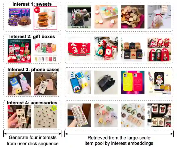 我们基于一个实际用户进行了案例分析。我们的多兴趣抽取模块从用户的历史点击序列中学习到了用户近期的四种不同的兴趣,包括甜品、礼物盒、手机壳以及小配件。左侧是用户点击过的商品,右侧是对应的兴趣表征从大规模商品池中召回回来的一些商品。