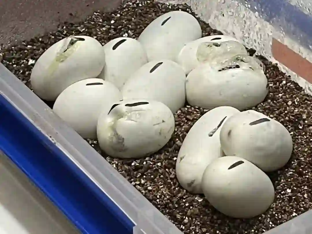 6月份,经过55天的孵化时间,蛇佬腔刚好有一窝蛇蛋陆续破壳。这是他等待半年的结果,1月份把蛇放入冬眠箱,维持15度的气温,一个来月后,蛇进入发情期、交配,之后再慢慢等待……