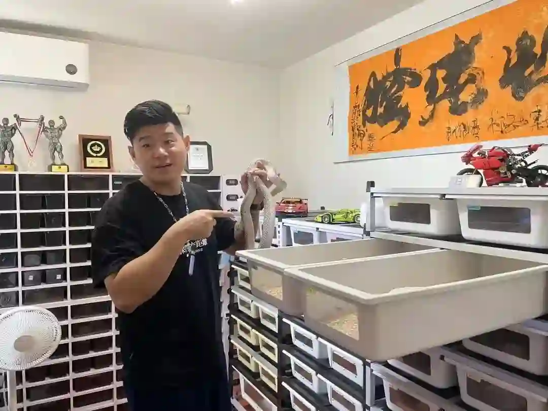 养蛇真正的乐趣,是收集。蛇有很多派系,有人养猪鼻蛇,有人养王蛇,有人养牛蛇。但真正爱蛇的人是不分品种的——他们最痴迷的是基因,有了这个基因,就想有其他基因,跟集盲盒一样,所以没有人养蛇之后能只养一条。