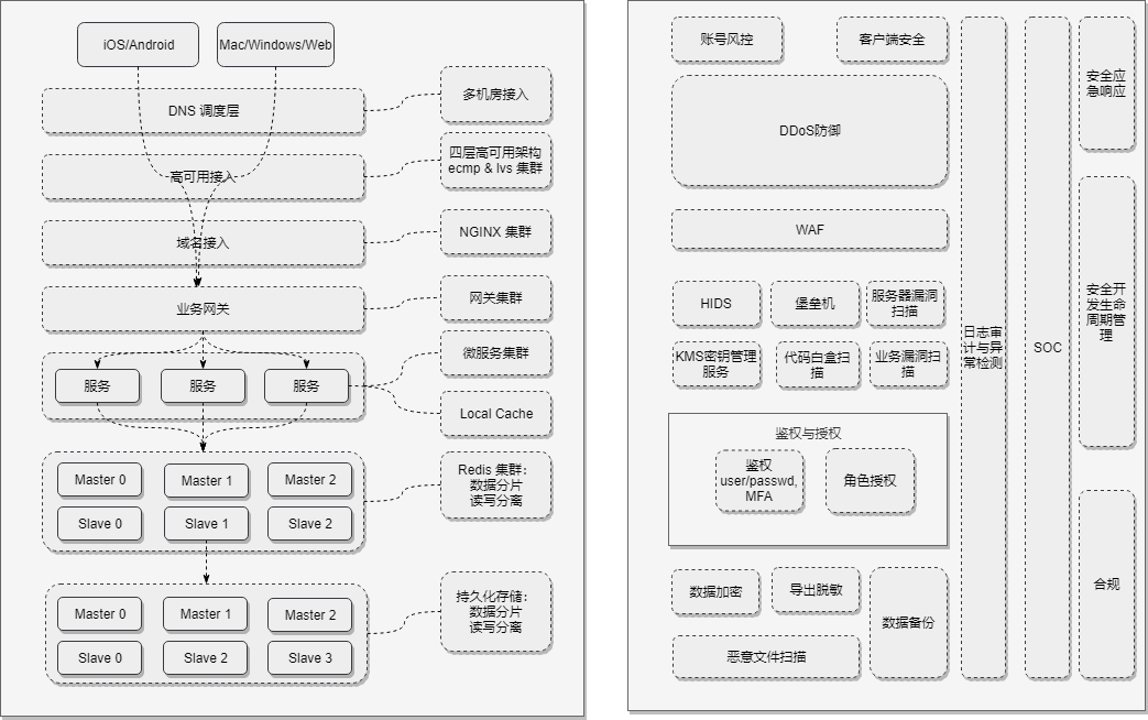 下图左侧是飞书整体的架构,右侧是安全架构。在数据传输加密技术上,飞书采用内外网端到端加密和 SSL/TLS 传输;在数据存储加密上,采用 AES 256 算法加密,通过 KMS 管理主密钥和数据密钥,就连飞书的研发人员都不能直接接触用户的生产数据。并采用定期自动全量或增量备份数据,离线多地存储,两地多中心,全方位保障数据安全。