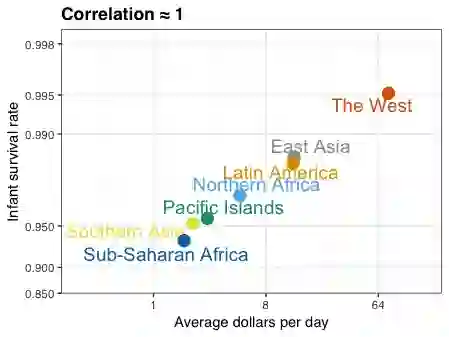 在分享辛普森悖论的动图以后,有些人问我生态谬误是不是相同的情况。其实这二者是不同的。生态谬误是我们试图通过平均值的强相关性来推断个体之间的相关性。为了更好的解释,我用dslabs包中自带的gapminder的数据(http://gapminder.org/)画出了一个动图,展示新生儿存活率的对数与日均收入的对数之间的关系。可以看到在地区层面上二者相关度很高,但在各个国家层面上相关度很低。这是因为同一地区国家与国家之间的差异导致的。
