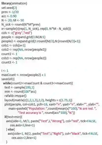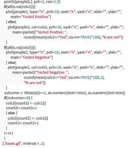 这个简单的动图展示的是将一种非常准确的诊断方法应用于一个发病率很低的群体的诊断结果。它展示出来的是,在已知诊断结果是阳性的情况下发病的先验概率,比该诊断方法的初试准确率要低。你可以用贝叶斯定律来确定真实的条件概率。更多细节请参考这里(https://simplystatistics.org/2014/10/17/bayes-rule-in-a-gif/)。