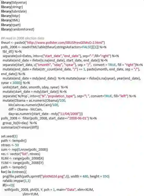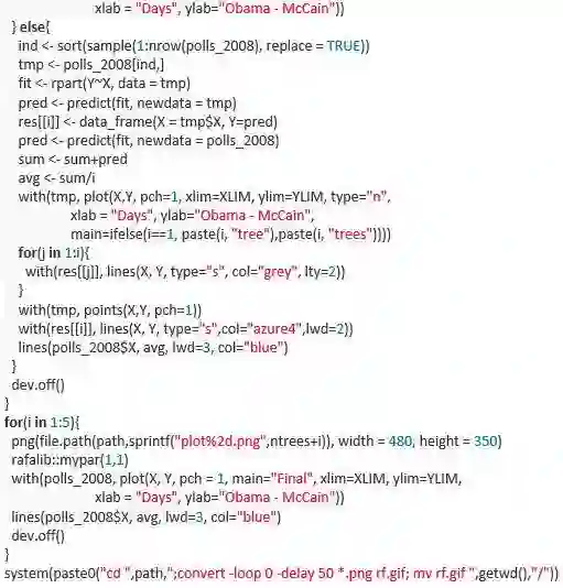 在过去的很长一段时间里,我都觉得很难理解为何随机森林作为一种基于树的算法,却能够产生平滑的预测。这里的gif图帮助我理解了原因。我用的是2008年总统选举的数据库,因为我认为该数据的趋势总体是平滑的,但是有几个尖锐的边,就连局部加权回归散点平滑法都很难预测。需要注意的是,我们只有一个影响因素,这个gif并不能展示出随机森林的另一个重要特点:随机的特征选取可以减少树与树之间的相关程度。