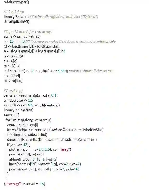 这里的数据来源是某个基因芯片实验。图中所示的是MA图,即比例对数与对数平均值之间的关系。我用animation包来保存gif动图。