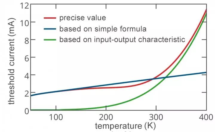 图2:纳米激光器的阈值电流与器件温度的之间对应关系。红色曲线表示精准值,而蓝色和绿色曲线给出了非常好的近似值。
