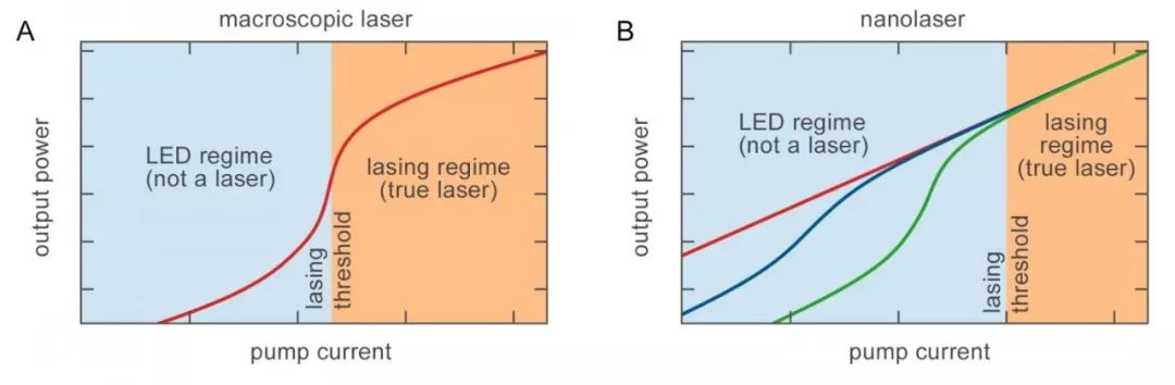 图1:在特定温度下,输出功率与泵浦电流的依赖关系,(A)是对于传统的宏观激光器来说,(B)是对于典型的纳米激光器来说。