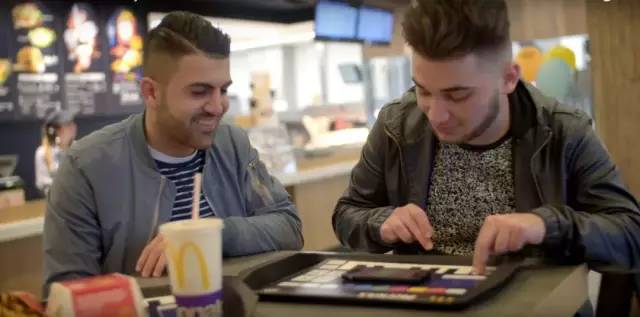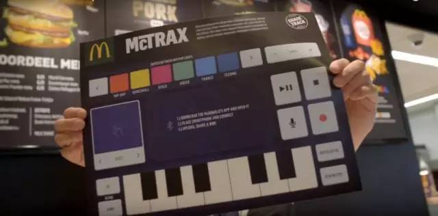 荷兰麦当劳推出的McTrax音乐垫餐纸,由一块小电池,导电油墨以及一块拥有 26 块数字接触点的薄电路板组成。通过蓝牙将手机与垫餐纸连接,自己就可以编辑音乐,它还具备录音功能,可以把创作带回家。