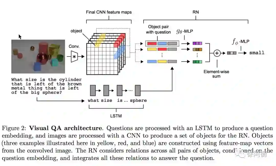RN 在 VQA 任务上的结构也很简单,CNN 处理图像,LSTM 编码 question,然后两两配对的 spatial cell(红蓝;黄红;蓝黄…)和 question embedding 拼接,后面接几个 FC 层,最后 softmax 得到某个 answer word。