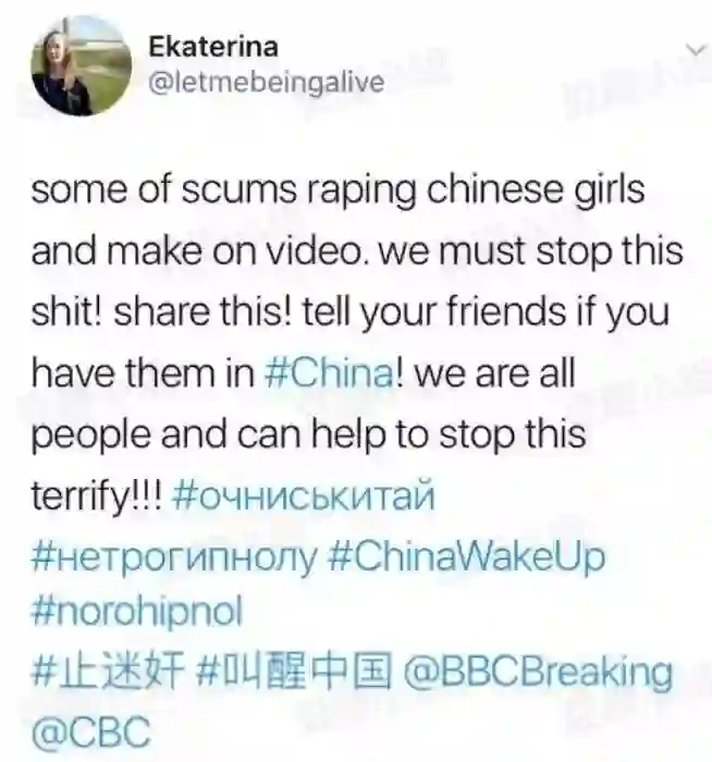 第四,被犯罪。最近国外网友在Twitter上发起了#Chinawakeup#的话题,事情的起因是她在网上看到很多女性被下药,被不法分子侵害的视频。这种被下迷奸药,女性在毫不知情的情况下被偷拍、强奸的视频,在成人视频网站上并不少见,甚至还可能成为卖点。
