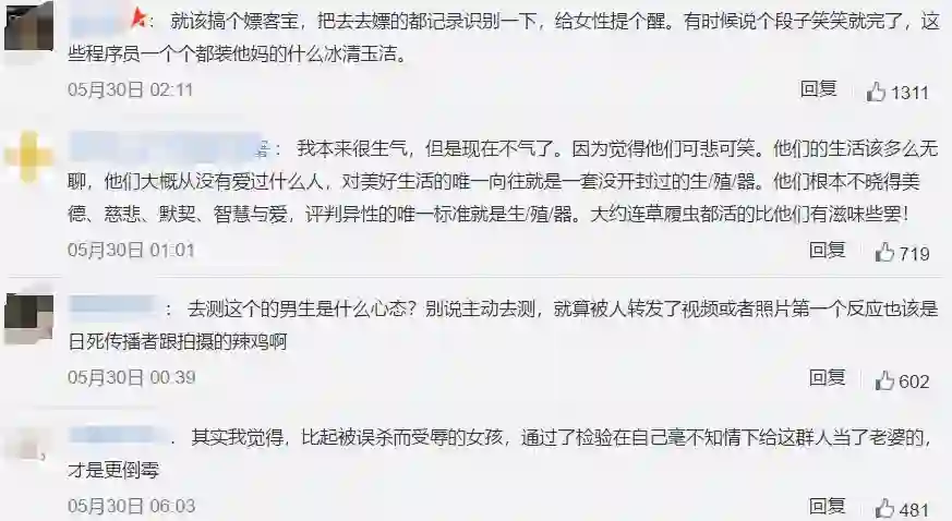 但更多人是愤怒,并反讽道:“冰清玉洁程序员”,“评判异性的唯一标准就是生殖器。大约连草履虫都活得比他们有滋味吧。”