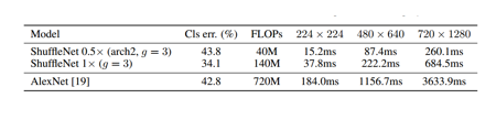 上表显示,相对于MobileNet,ShuffleNet的前向计算量不仅有效地得到了减少,而且分类错误率也有明显提升,验证了网络的可行性。