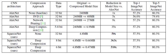 通过SqueezeNet+Deep Compression,可以将原始240M的AlexNet压缩至0.47M,实现约510x的压缩率。