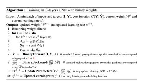 训练算法如图5所示,值得注意的是,只有在前向计算和后向传播时使用二值化后的权值,在更新参数时依然使用原始参数,这是因为如果使用二值化后的参数会导致很小的梯度下降,从而使得训练无法收敛。