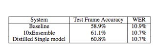 上表显示,蒸馏后的模型的精确度和单字错误率和用于产生软目标的10个模型的性能相当,小模型成功地学到了大模型的识别能力。