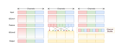 · 提出了核心的shuffle操作将不同group中的通道进行打散,从而保证不同输入通道之间的信息传递。
