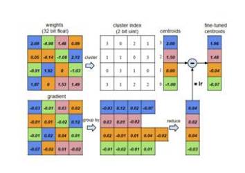 此处的权值量化基于权值聚类,将连续分布的权值离散化,从而减小需要存储的权值数量。