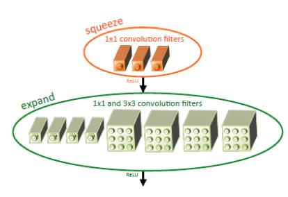 基于以上三个策略,作者提出了一个类似inception的网络单元结构,取名为fire module。一个fire module 包含一个squeeze 卷积层(只包含1x1卷积核)和一个expand卷积层(包含1x1和3x3卷积核)。其中,squeeze层借鉴了inception的思想,利用1x1卷积核来降低输入到expand层中3x3卷积核的输入通道数。如图1所示。